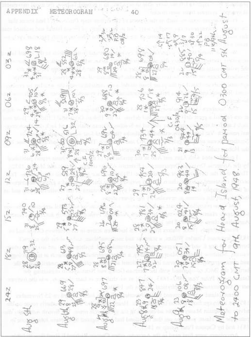 Figure 11 Example of a meteorogram from a paper by Gibbs (1949). Because of the paucity of data from the Southern Ocean at that time three-hourly observations from Heard and Macquarie Islands were plotted in this form.
